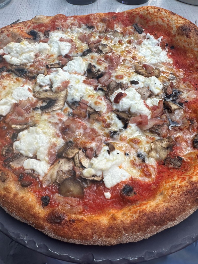 Thus far, we’ve thoroughly enjoyed a splendid Michelin-recognized resto, L’Écrin de Màrlene (my veal dish and dessert pictured above), and a crazy-good wood-fired pizza place, San Remo. (My ethereal pizza pictured below). The latter was so delicious and so cheap that we returned on back-to-back nights and are tempted to dine there tonight as well. Right, if it ain’t broke . . .